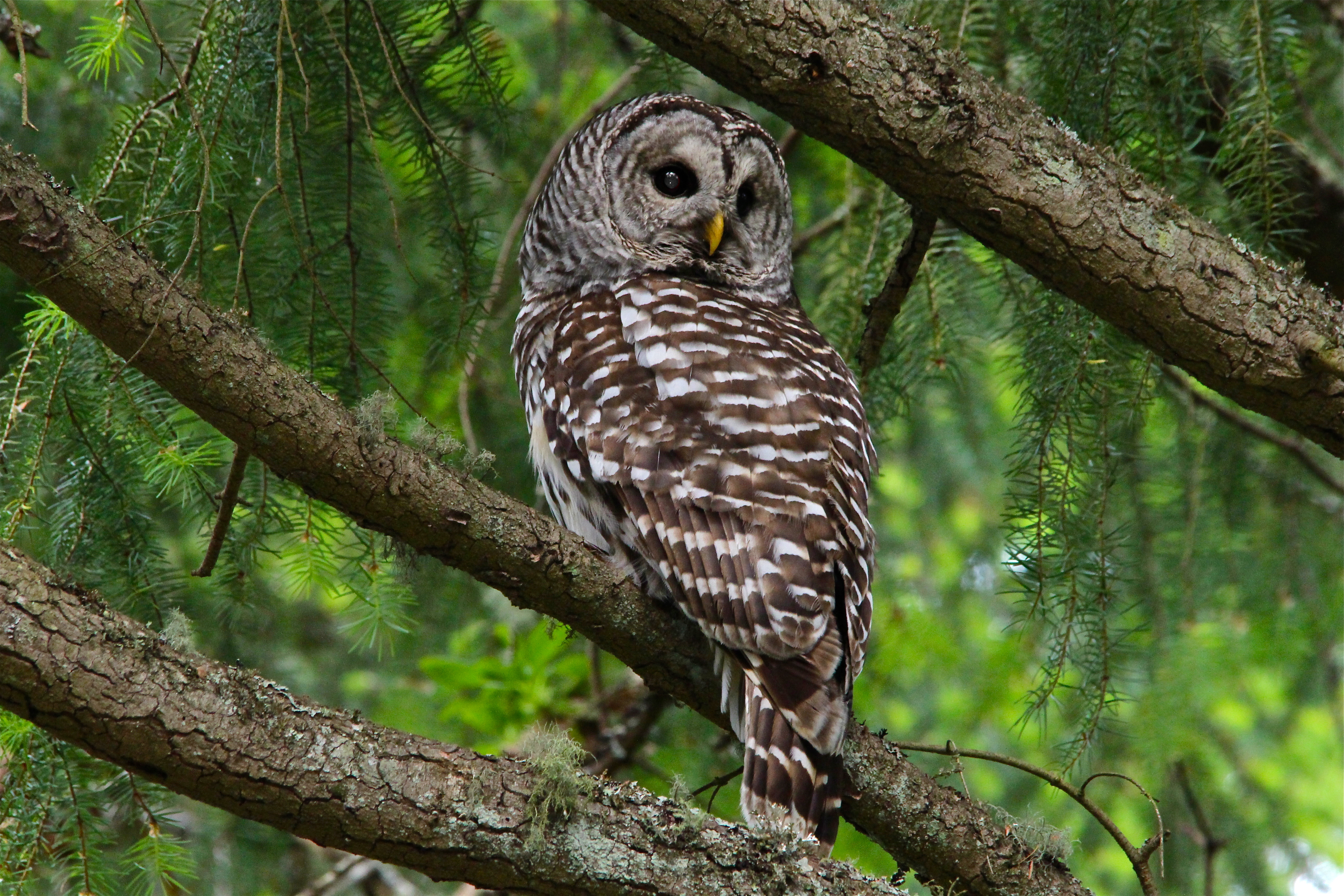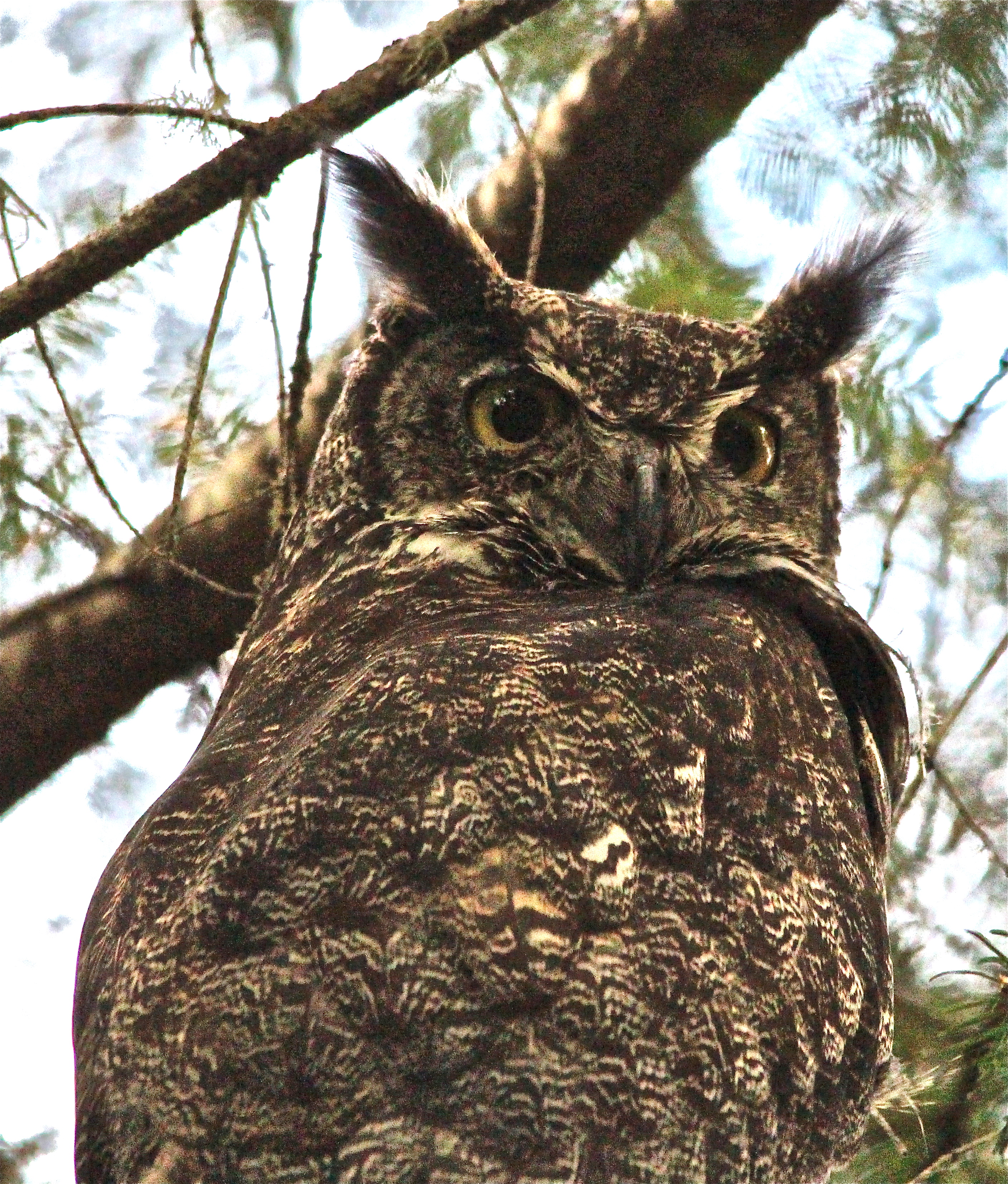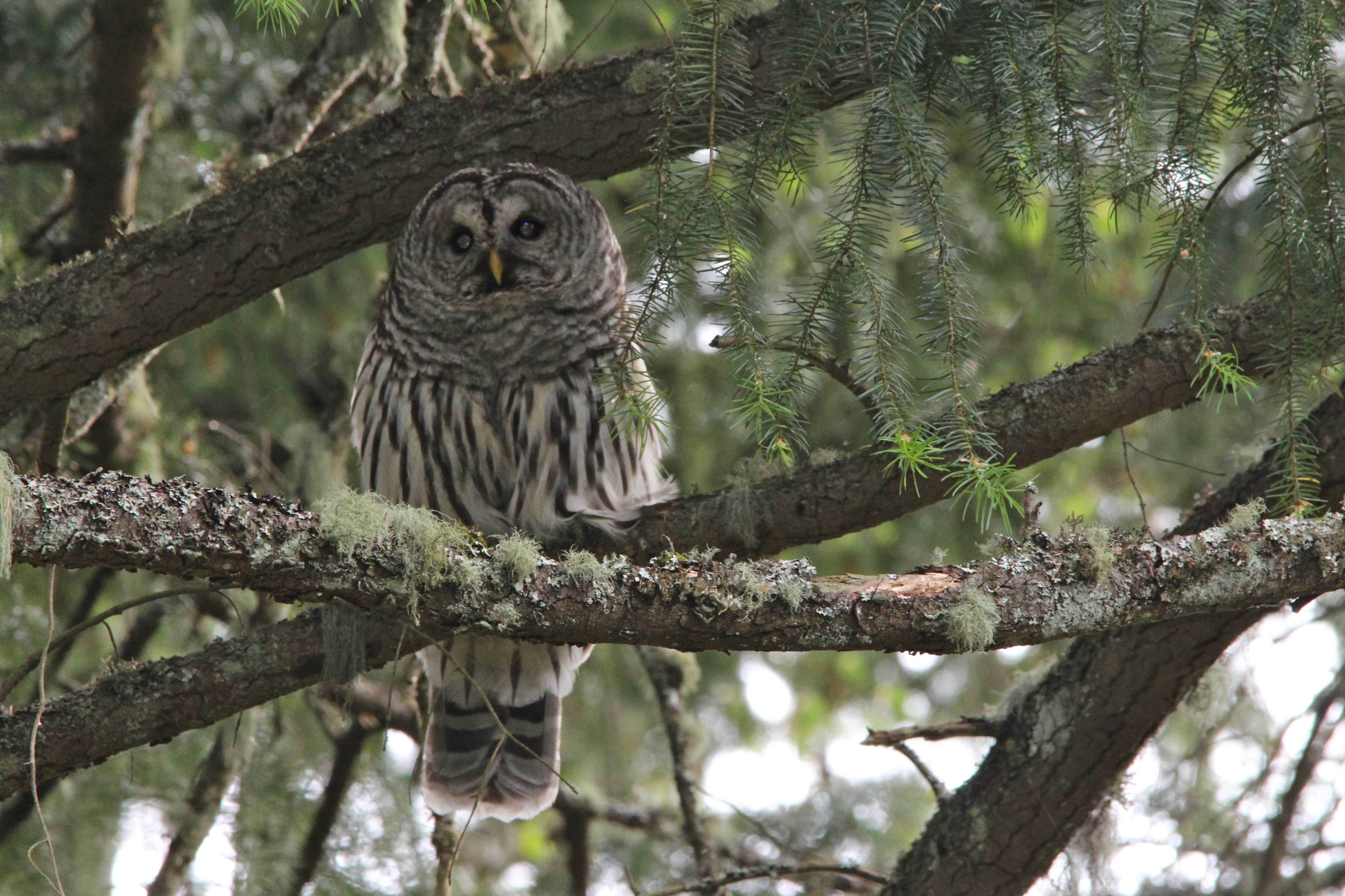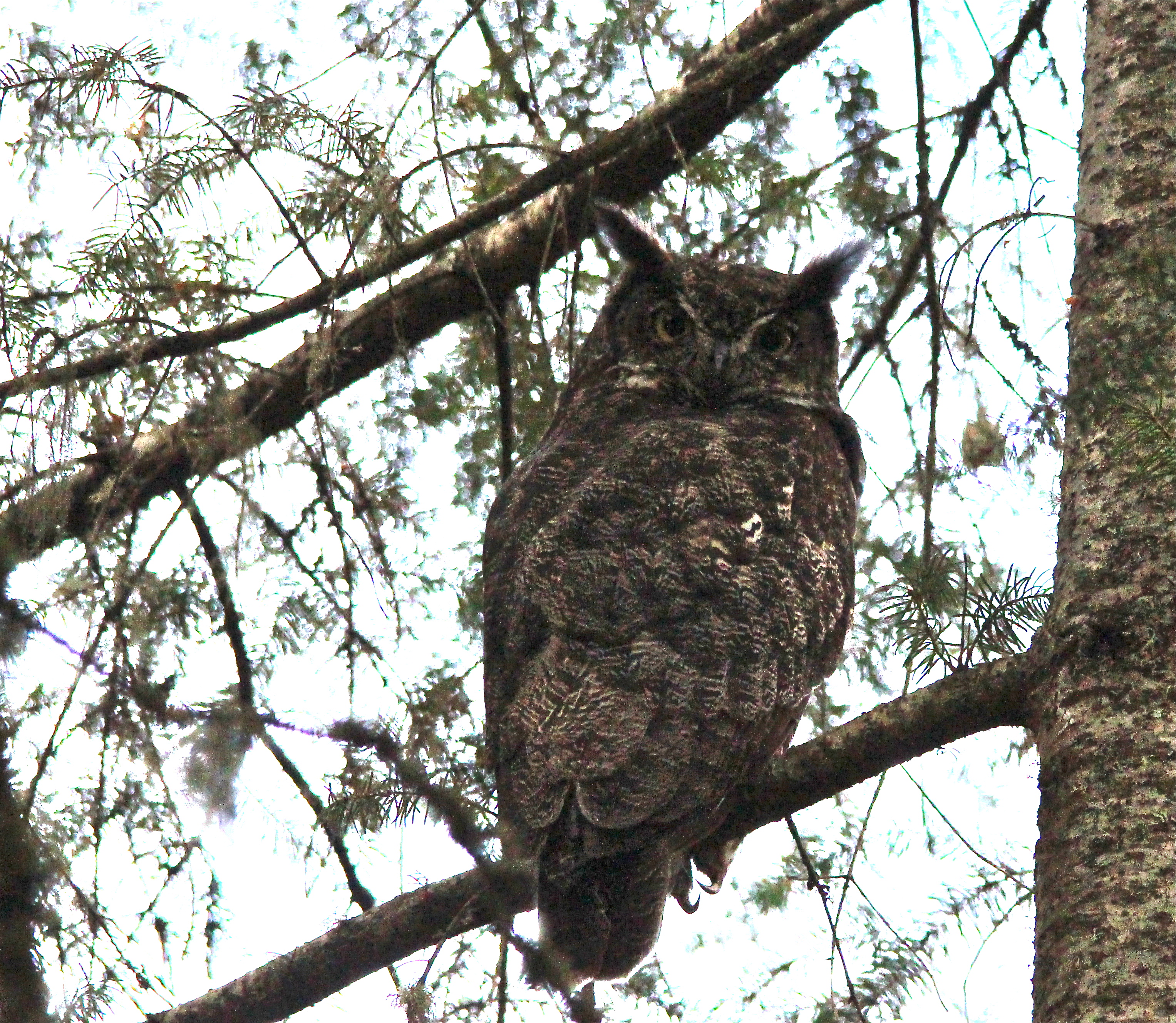 Hearing a great ruckus being made by a raven, I found this owl in the Douglas fir woods, apparently one of three by the sounds of their wheezy hissing. We believe the nest is along the power-line clearing, which runs toward the base of Mt. Work.  I thought this was a chick, but further research [on-line] indicates, it is likely one of the parents of what we believe are three chicks.